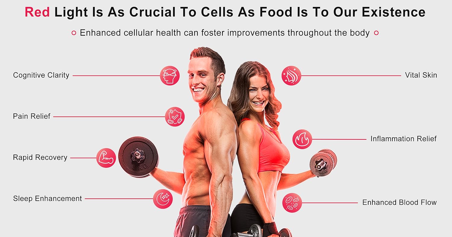 Scientific research has demonstrated that red light therapy offers numerous benefits by utilizing photons (particles of light) near the skin. When these photons penetrate the tissue, they activate the chromophore, which isresponsible for the molecule's color. This activation leads to improved cellular mitochondrial energy production, increased availability of intracellular ATP (adenosinetriphosphate), enhanced cell function and repair, improved skin health, reduced inflammation and pain, and increased skin elasticity and gloss.